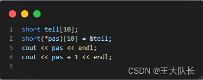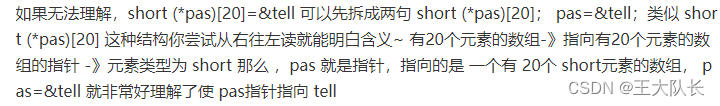 我们在上面代码中构建了一个指针pas指向整个数组tell来代替上述的&tell(因为我们不能对数组名进行修改,但能对指针进行修改),对于这个指针的定义的理解参考: