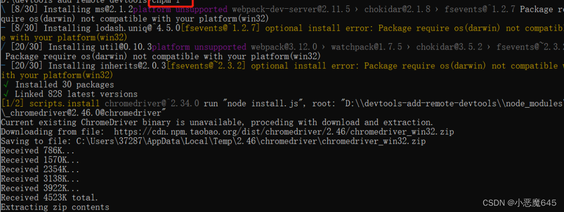 3.在命令行中切换到解压好的vue-devtools目录,使用npm install命令进行依赖安装。