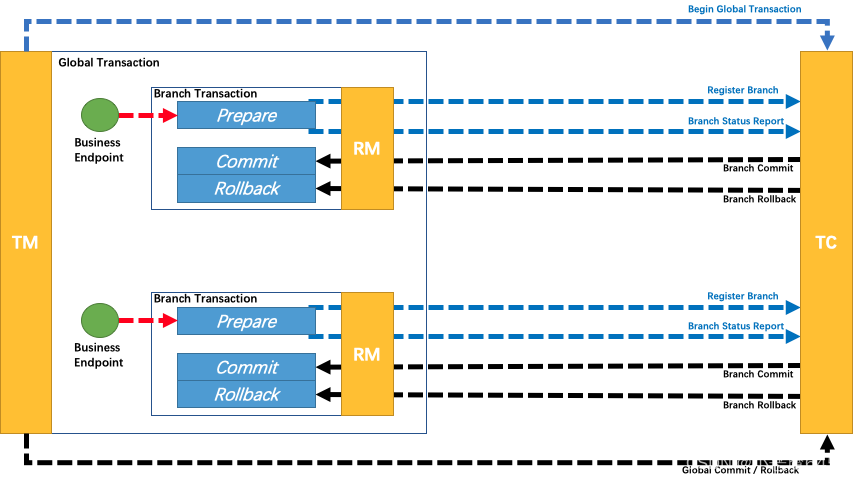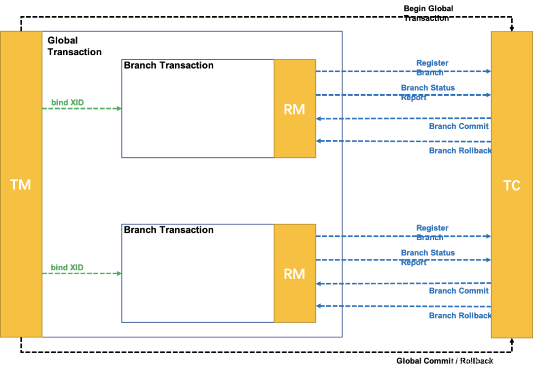 分支事务注册:事务发起方将全局事务ID和分支事务ID发送给各个参与者(Participant),即资源管理器。参与者将分支事务ID注册到本地事务管理器,并将事务的执行结果反馈给事务协调器。
