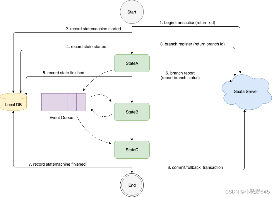SAGA模式:SAGA模式是一种基于事件驱动的分布式事务模式。在SAGA模式中,每个服务都可以发布和订阅事件,通过事件的传递和处理来实现分布式事务的一致性。Seata提供了与SAGA模式兼容的Saga框架,用于管理和协调分布式事务的各个阶段。
