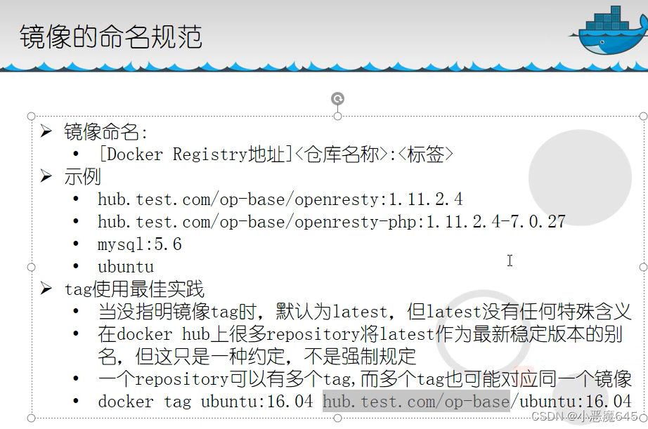 仓库:用来存放镜像的地方,每个镜像有不同标签(tag)。