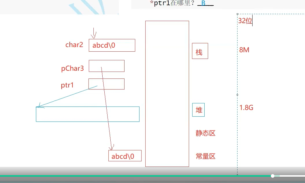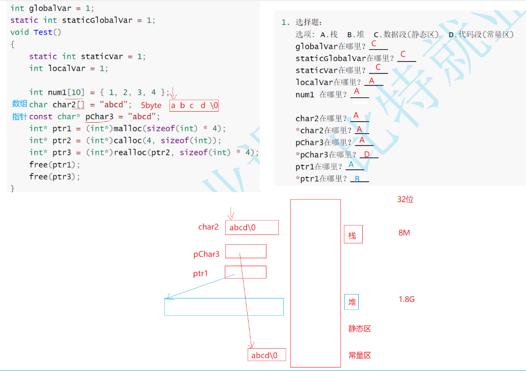 局部变量都是在栈上的,因为函数调用会建立栈贞,分区分的是生命周期,堆不去free一直在,栈出了作用域就销毁了,静态区 函数结束局部的static还在,因为放在静态区,一次性,局部, 长期局部:静态 动态申请:堆,不需要修改的:常量区的