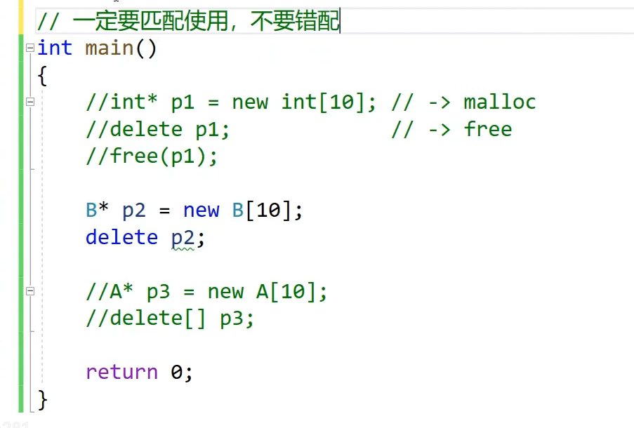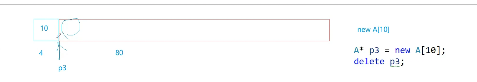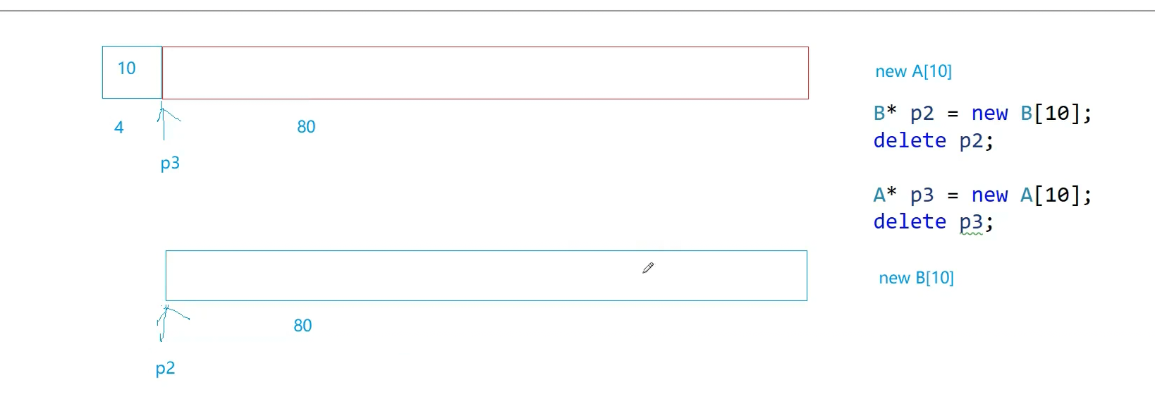 P3指向位置不对,前面还有多开的空间,没有释放,B不开这四个字节因为编译器给优化了,因为编译器看到B没写析构函数,也就是说这个个数给delete【】用,我不知道调用多少个析构函数,所以p3往前偏移四个字节取到个数,b由于没写析构编译器检查了一下,没什么资源要释放,自动生成的析构也不需要做什么事情,所以编译器一步到底就不调析构函数了,也就不需要多余空间了,p3有问题的原因是,deletep3 不存在头上申请个数这样的问题那我就调用一次析构,把这个对象析构了最后operator delete调到free是从这个地方释放的