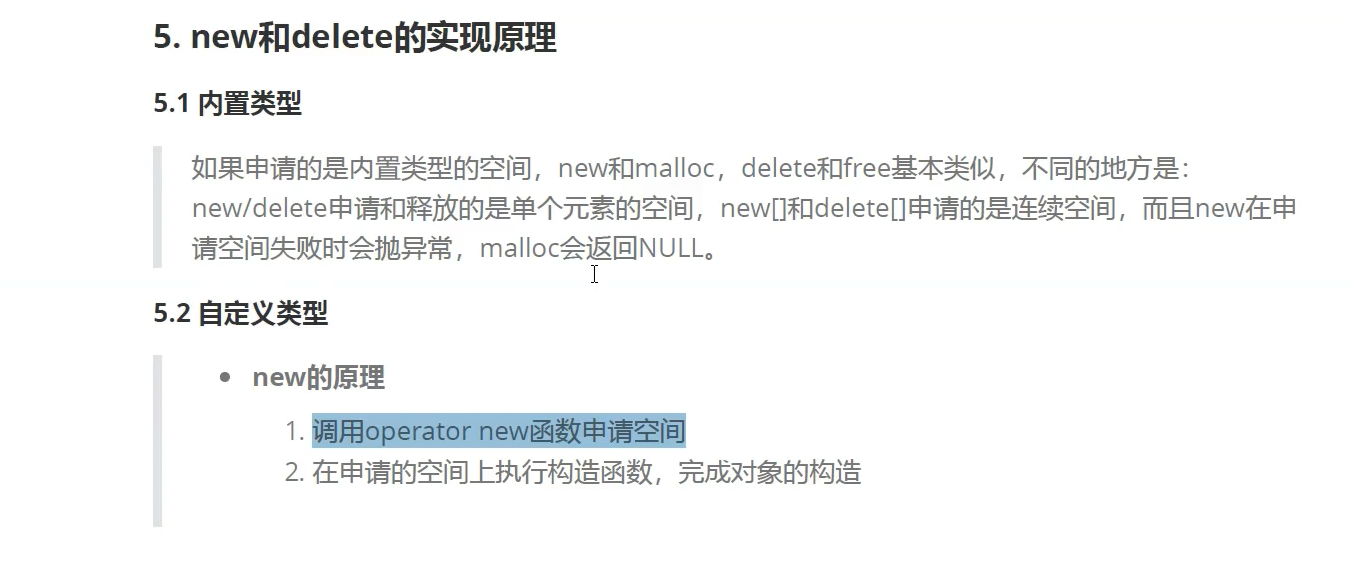 malloc是new的一个组成部分,内置类型new直接调用operator new,自定义类型,new 调用operator new operator new 调用malloc 申请空间成功后调用构造函数,完成初始化,