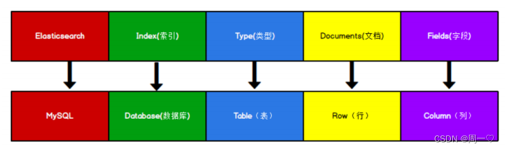 ES 里的 Index 可以看做一个库,而 Types 相当于表, Documents 则相当于表的行。这里 Types 的概念已经被逐渐弱化, Elasticsearch 6.X 中,一个 index 下已经只能包含一个 type , Elasticsearch 7.X 中 , Type 的概念已经被删除了