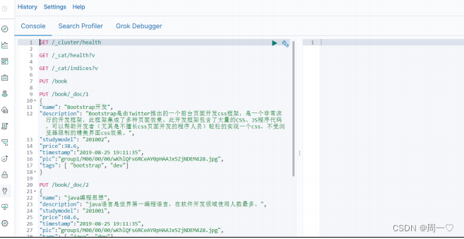 1 、 kibana 是 es 数据的前端展现,数据分析时,可以方便地看到数据。作为开发人员,可以方便访问 es 。https://www.elastic.co/cn/downloads/历史版本下载: https://www.elastic.co/cn/downloads/past-releases/2 、下载,解压 kibana 。3 、启动 Kibana : bin\kibana.bat4 、浏览器访问 http://localhost:5601 进入 Dev Tools 界面。像 plsql 一样支持代码提示。5 、发送 get 请求,查看集群状态 GET _cluster/health 。相当于浏览器访问。