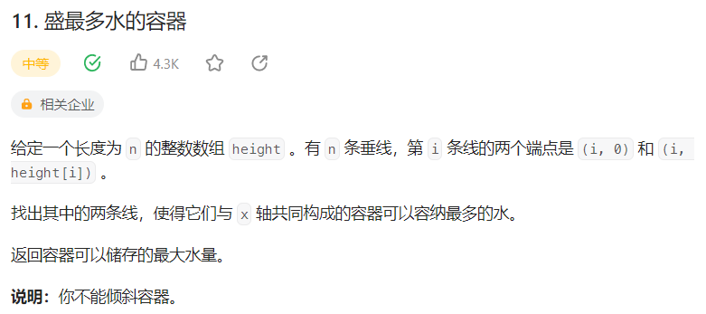 机试打卡 -07 盛水的容器(双指针) 假设某一时刻,water=W,选择容器的左边界索引为 i ,高度为 height[i]。那么容器至少需要 W/height[i] 的宽度才有可能突破 W 的容量上限。优化一下:当每次选择一个容器的左边界时,并不需要遍历计算之后每一条垂线充当右边界的情况。最简单粗暴的方法,两个for循环,遍历 n(n-1)/2 次,当然超时。