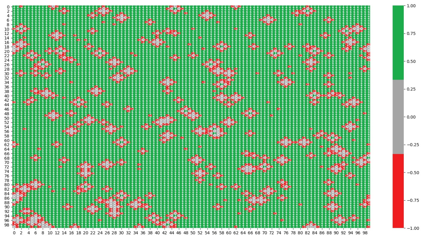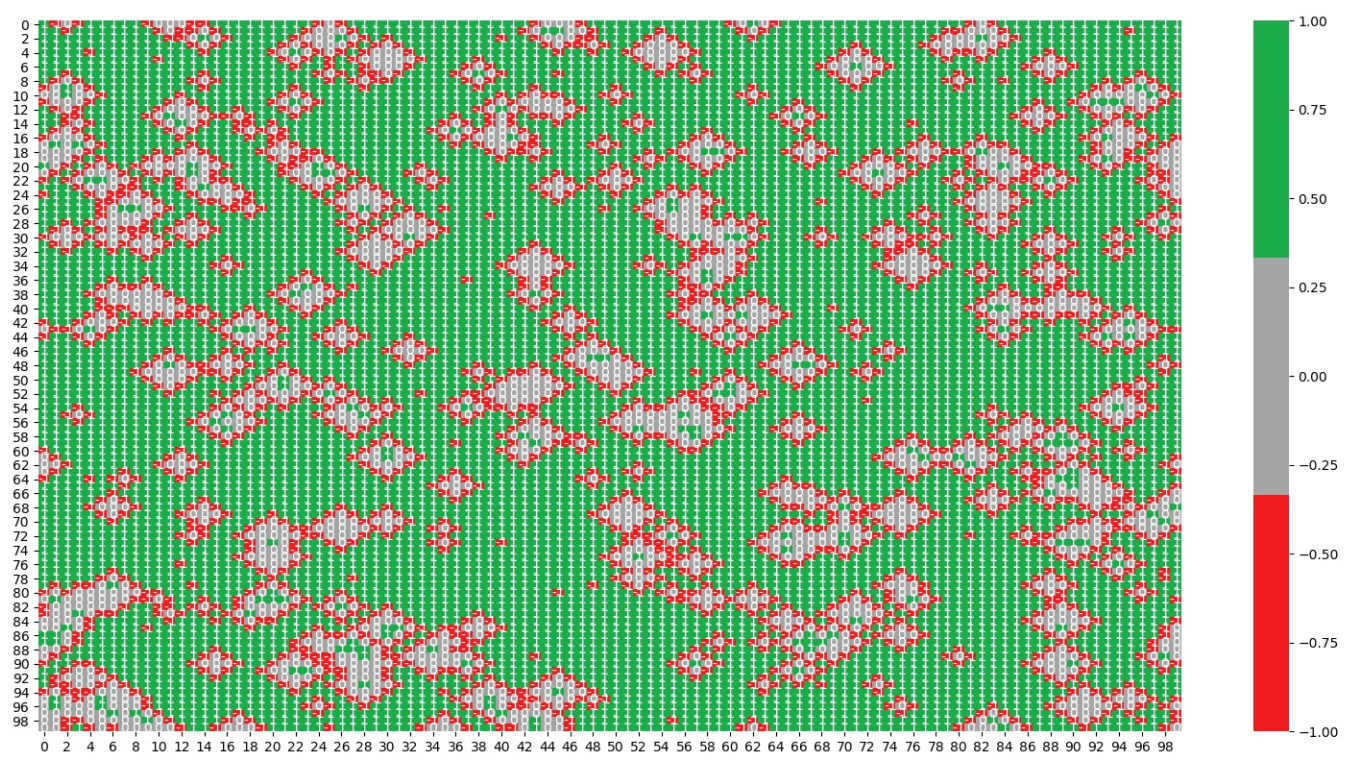 每当一个新的演化时间点到来时,首先要执行 空位生长树木 (0 --> 1) 的操作。若这一操作滞后,则会导致前一时刻燃烧的树木在这一时刻烧尽后重新生长为树木,故这一演化的优先级较高。并且需要将符合条件的坐标存储(而不是直接将矩阵元素更改),若不如此处理,则会导致中心灰烬点重焕生机后再次被周围的余火吞噬,无法达到 空位生长树木 (0 --> 1) 的效果。