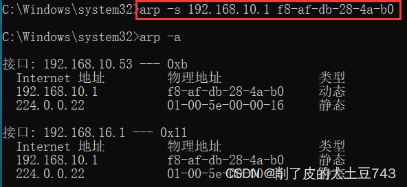 假设当前网关的 IP 地址是 192.168.0.1,MAC 地址是 5c-d9-98-f1-89-64,请使用 arp -s 192.168.0.1 5c-d9-98-f1-89-64 命令设置其为静态类型的。