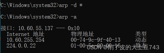 为防止干扰,先使用 arp -d * 命令清空 arp 缓存