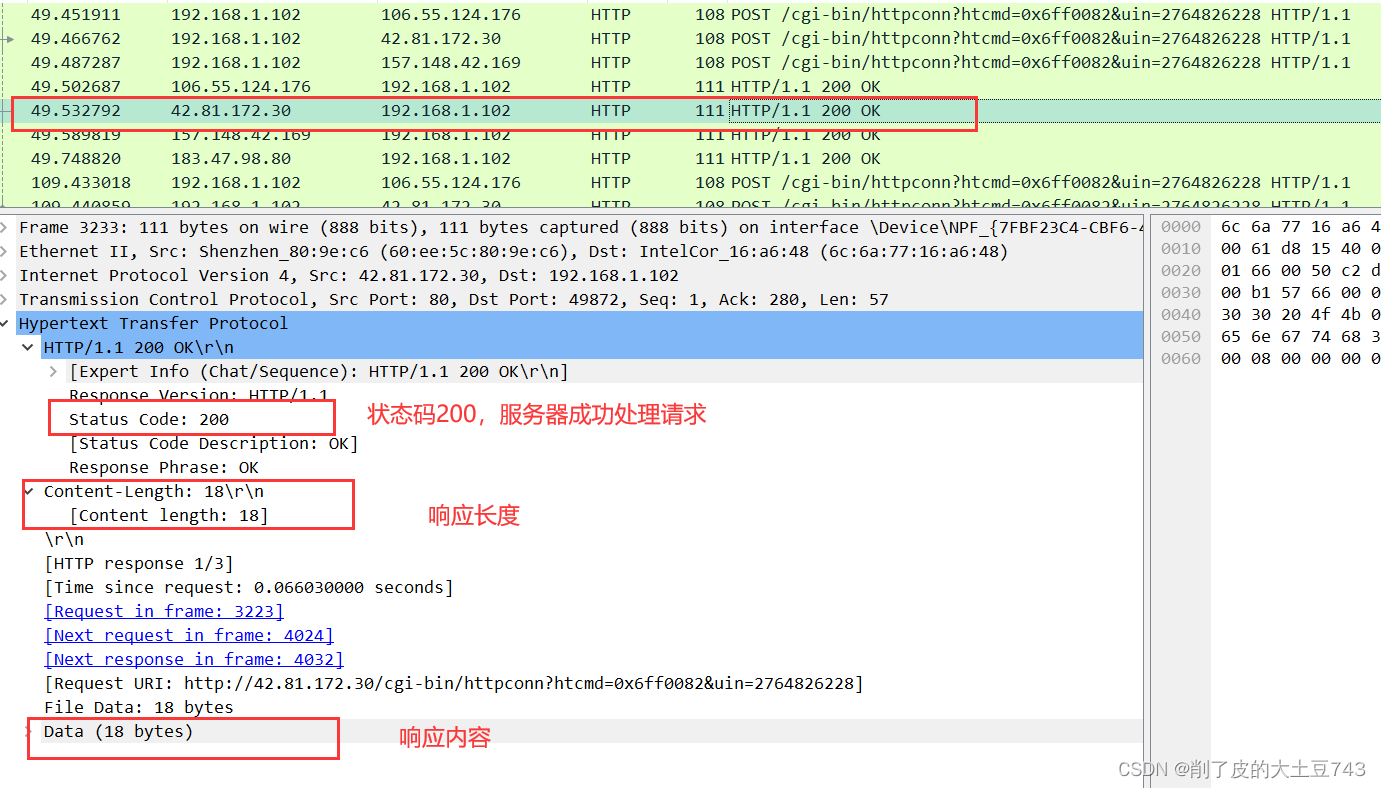 请在你捕获的包中找到 HTTP 应答包,查看应答的代码是什么,如: