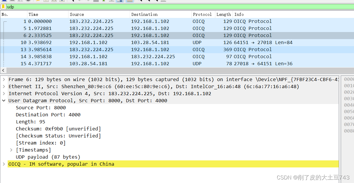 用 Wireshark 任意抓包(可用 udp 过滤),熟悉 UDP 段的结构,如:源端口、目的端口、长度等。