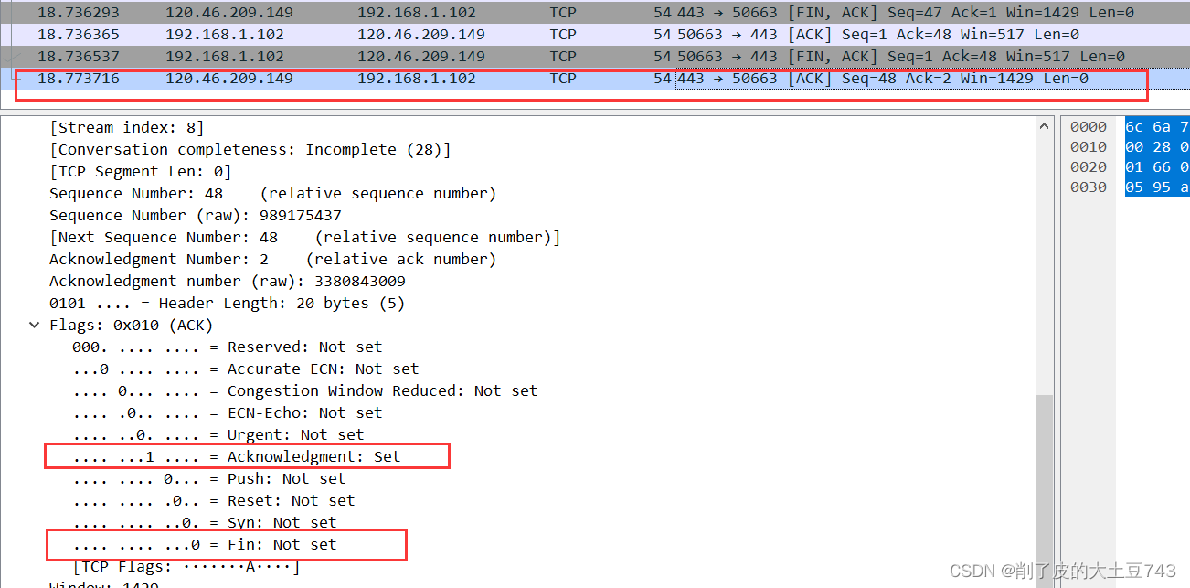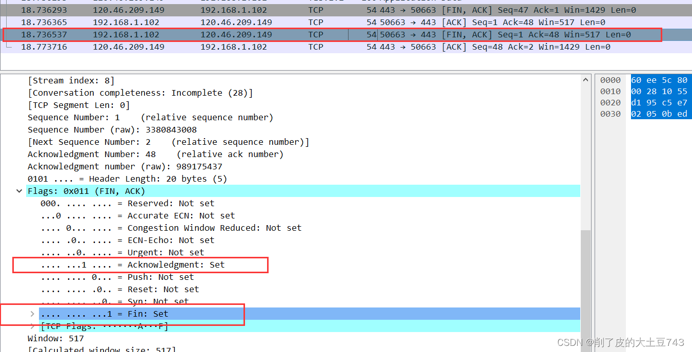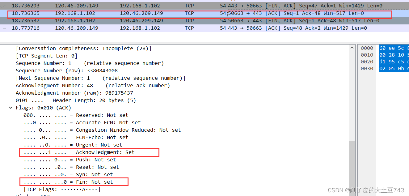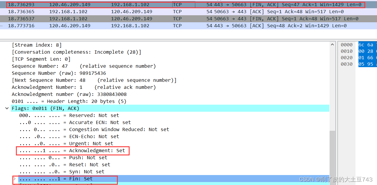 原因是将第二次、第三次挥手发出的包合并为了一个。