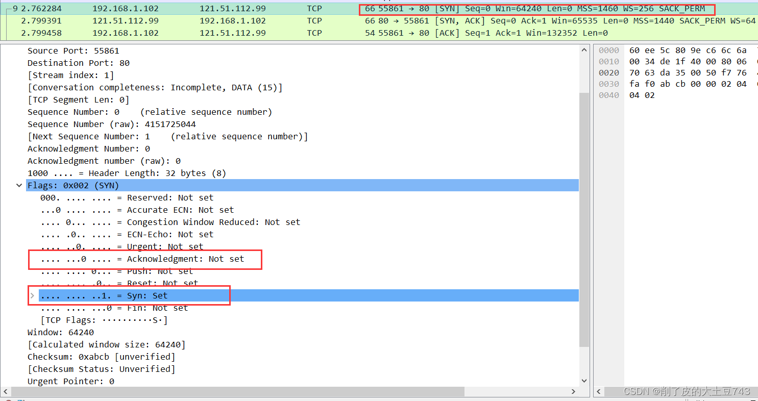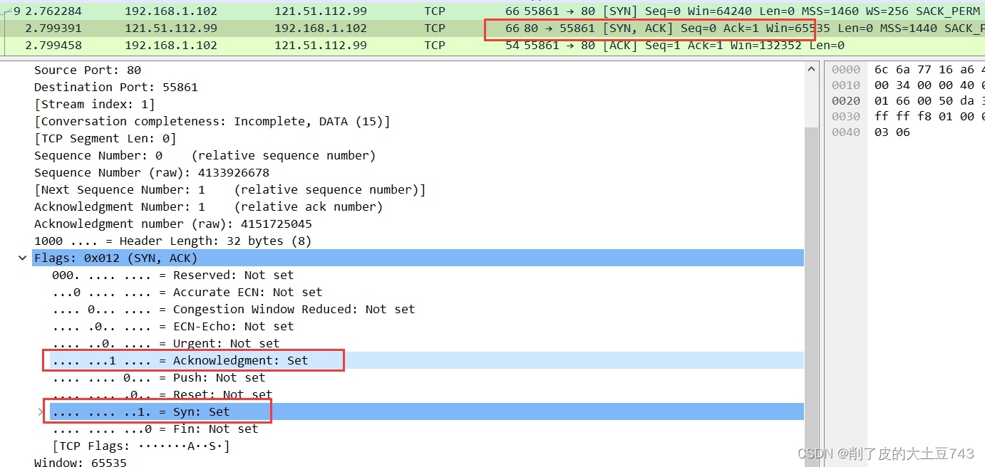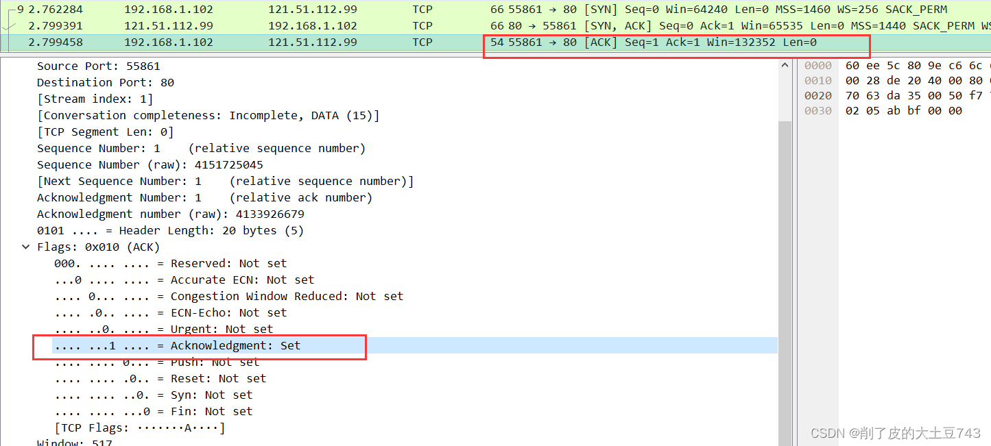 原因是将第二次、第三次挥手发出的包合并为了一个。