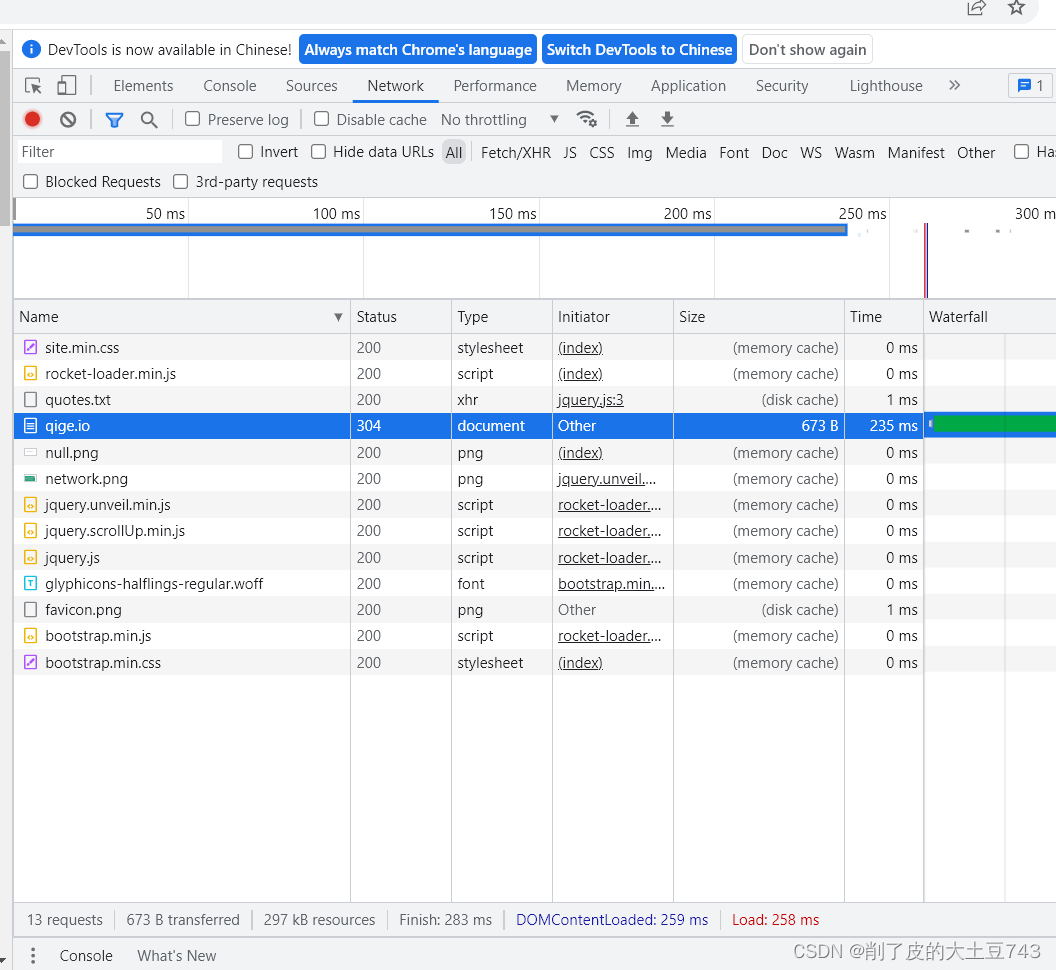 打开 Chrome 或 Firefox 浏览器,访问 https://qige.io ,接下来敲 F12 键 或 Ctrl + Shift + I 组合键打开开发者工具,选择 Network 面板后刷新页面,你会在开发者工具底部看到加载该页面花费的时间。请进一步查看哪些文件被 cache了,哪些没有。