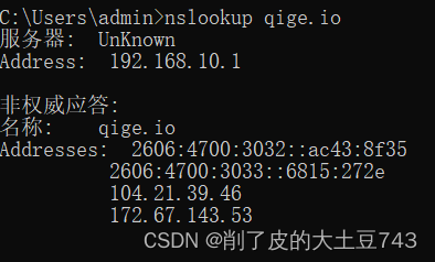 使用 nslookup qige.io 命令,将使用默认的 DNS 服务器查询该域名。当然你也可以指定使用 CloudFlare(1.1.1.1)或 Google(8.8.8.8) 的全球 DNS 服务器来解析,如:nslookup qige.io 8.8.8.8