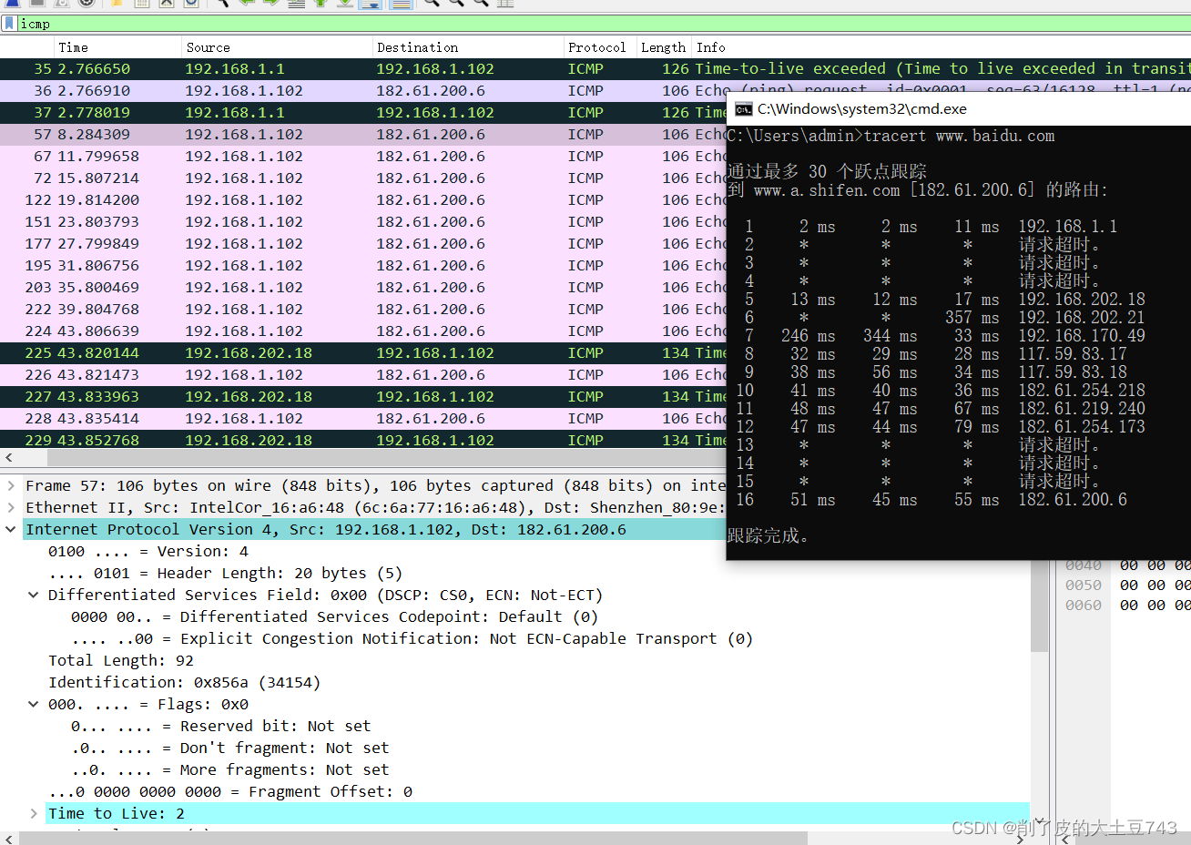 请使用 tracert www.baidu.com 命令进行追踪,此时使用 Wireshark 抓包(用 icmp 过滤),分析每个发送包的 TTL 是如何进行改变的,从而理解路由追踪原理。