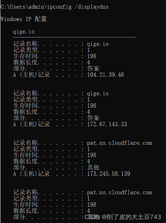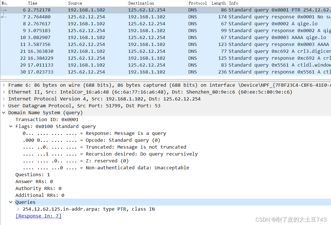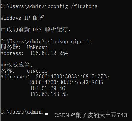 先使用 ipconfig /flushdns 命令清除缓存,再使用 nslookup qige.io 命令进行解析,同时用 Wireshark 任意抓包(可用 dns 过滤)。