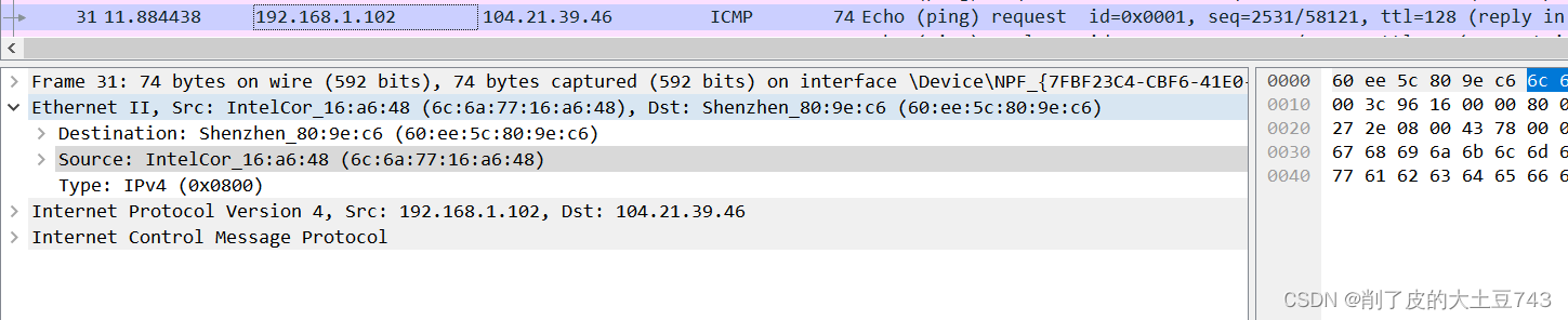 ping 你旁边的计算机(同一子网),同时用 Wireshark 抓这些包(可使用 icmp 关键字进行过滤以利于分析),记录一下发出帧的目的 MAC 地址以及返回帧的源 MAC 地址是多少?这个 MAC 地址是谁的?