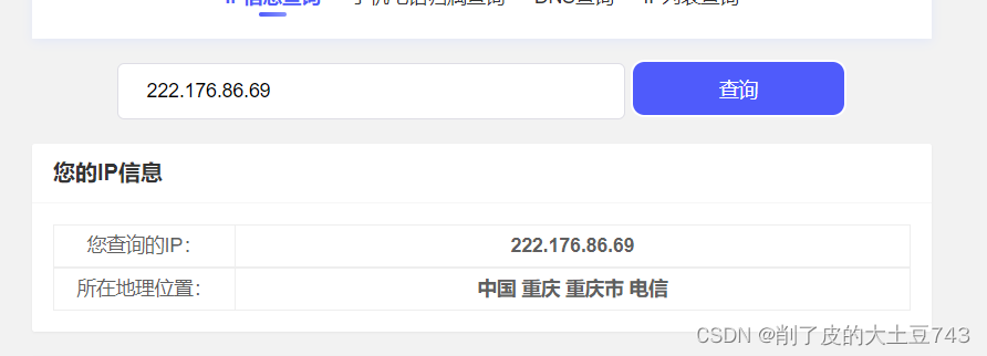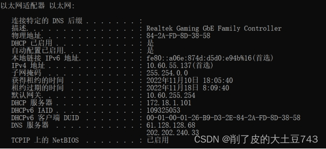 IP地址:IP是32位二进制数据,通常以十进制表示(即最大值为255.255.255.255)。我的IP地址是10.60.55.137