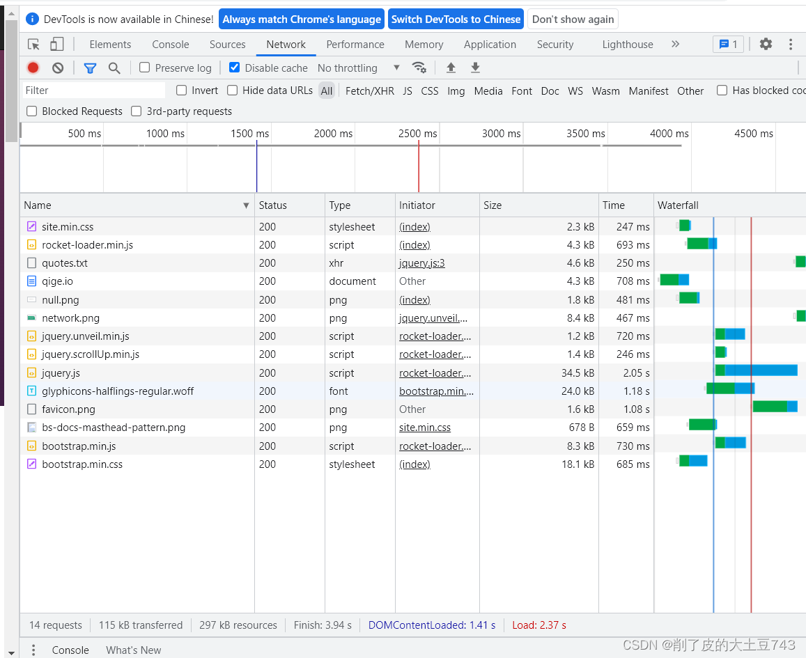 接下来仍在 Network 面板,选择 Disable cache 选项框,表明当前不使用 cache,页面数据全部来自于 Internet,刷新页面,再次在开发者工具底部查看加载该页面花费的时间。你可比对与有 cache 时的加载速度差异。