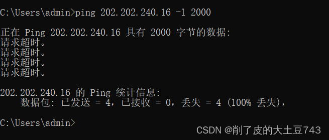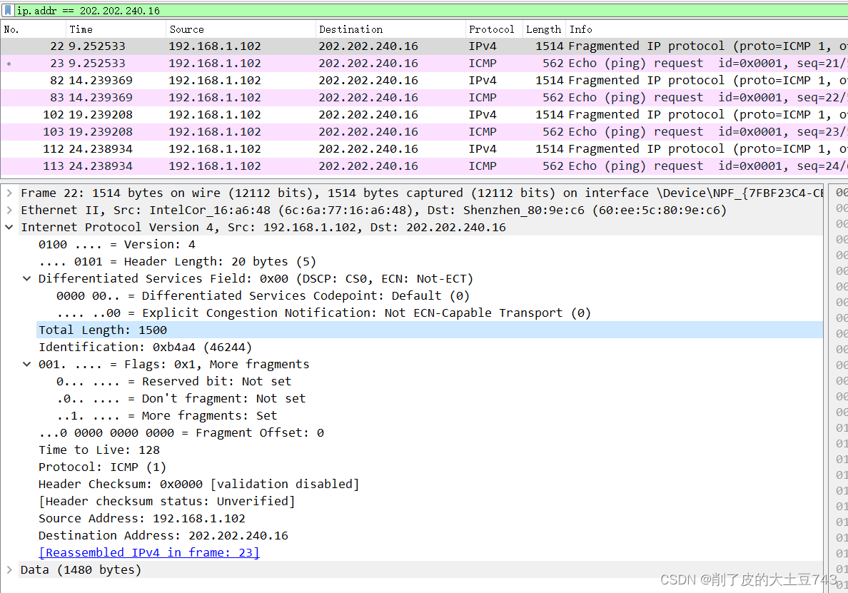 缺省的,ping 命令只会向对方发送 32 个字节的数据。我们可以使用 ping 202.202.240.16 -l 2000 命令指定要发送的数据长度。此时使用 Wireshark 抓包(用 ip.addr == 202.202.240.16 进行过滤),了解 IP 包如何进行分段,如:分段标志、偏移量以及每个包的大小等