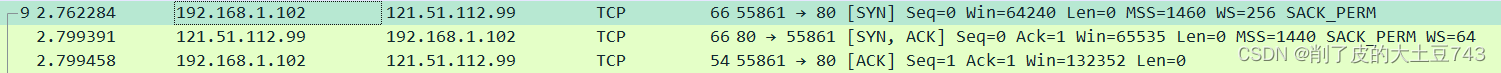 请在你捕获的包中找到三次握手建立连接的包,并说明为何它们是用于建立连接的,有什么特征。