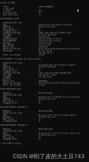 使用 Ipconfig/all 查看计算机的网络配置,尽可能明白每行的意思,特别注意 IP 地址、子网掩码 Subnet Mask、网关 Gateway。
