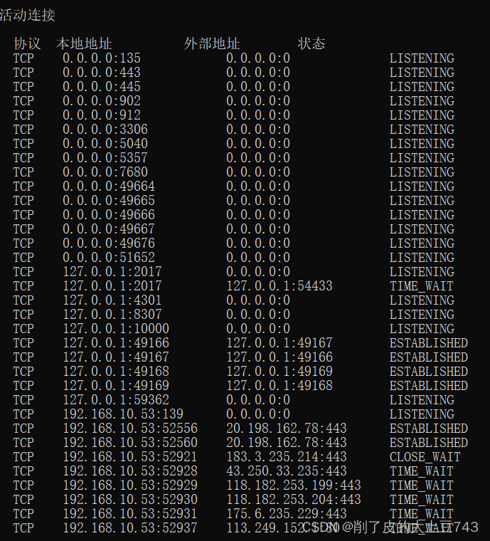netstat(Network Statistics)是在内核中访问网络连接状态及其相关信息的命令行程序,可以显示路由表、实际的网络连接和网络接口设备的状态信息,以及与 IP、TCP、UDP 和 ICMP 协议相关的统计数据,一般用于检验本机各端口的网络服务运行状况。