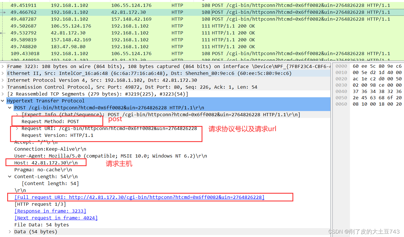 请在你捕获的包中找到 HTTP 请求包,查看请求使用的什么命令,如: