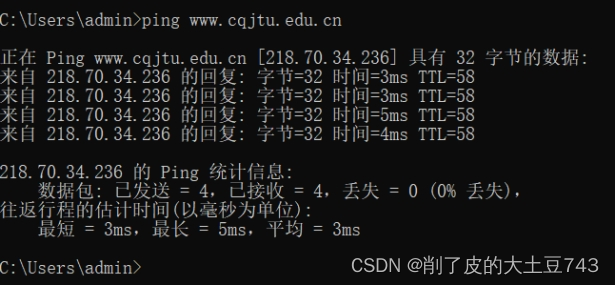 要测试到某计算机如 重庆交通大学 Web 服务器的连通性,可以使用 ping www.baidu.com 命令,也可直接使用ip地址
