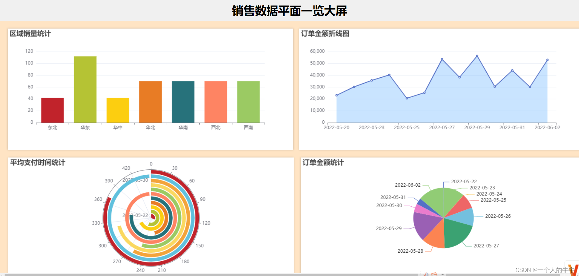 springboot+echarts +mysql制作数据可视化大屏(四图) 作者水平低,如有错误,恳请指正!谢谢!!!!!项目简单,适合大学生参考分类专栏还有其它的可视化博客哦!专栏地址:https://blog.csdn.net/qq_55906442/category_11906804.html?spm=1001.2014.3001.5482目录 一、数据源二、所需工具三、项目框架搭建四、代码编写4.1 区域销量统计条形图4.2 订单金额折线图4.3 平均支付时间统计4.4 订单金额统计五、大屏编写成果展示: 1)可以使用自己的MySQL数据库;2)使用我提供的数据。(要