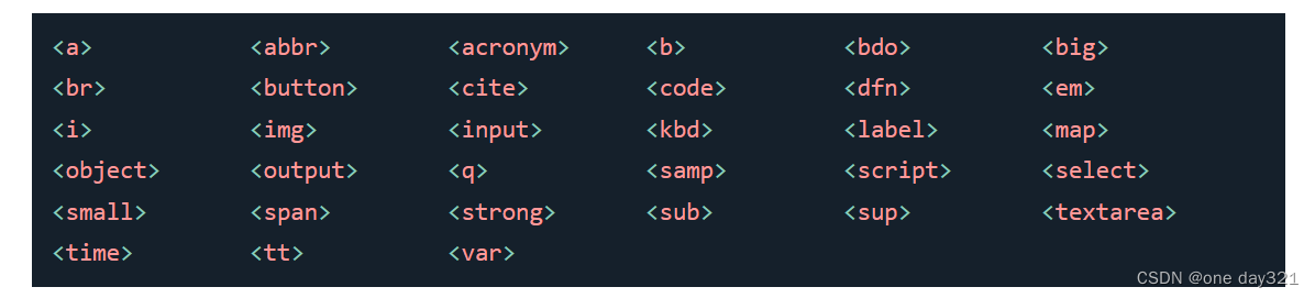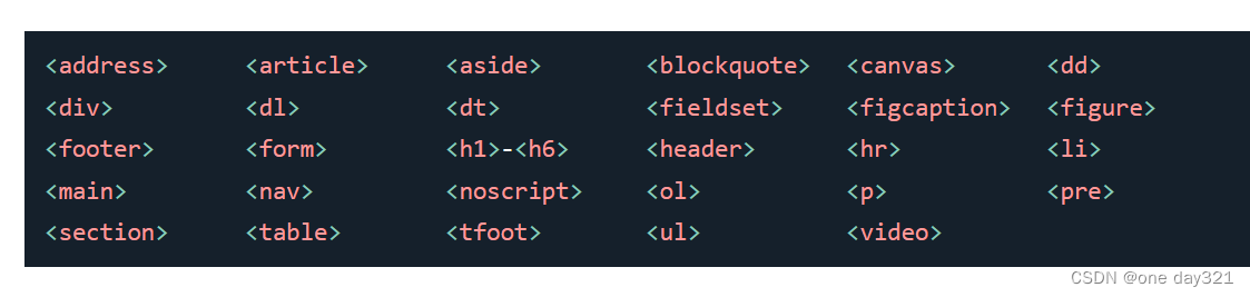 块元素:<div>、<p>、<form>、<aside>、<header>