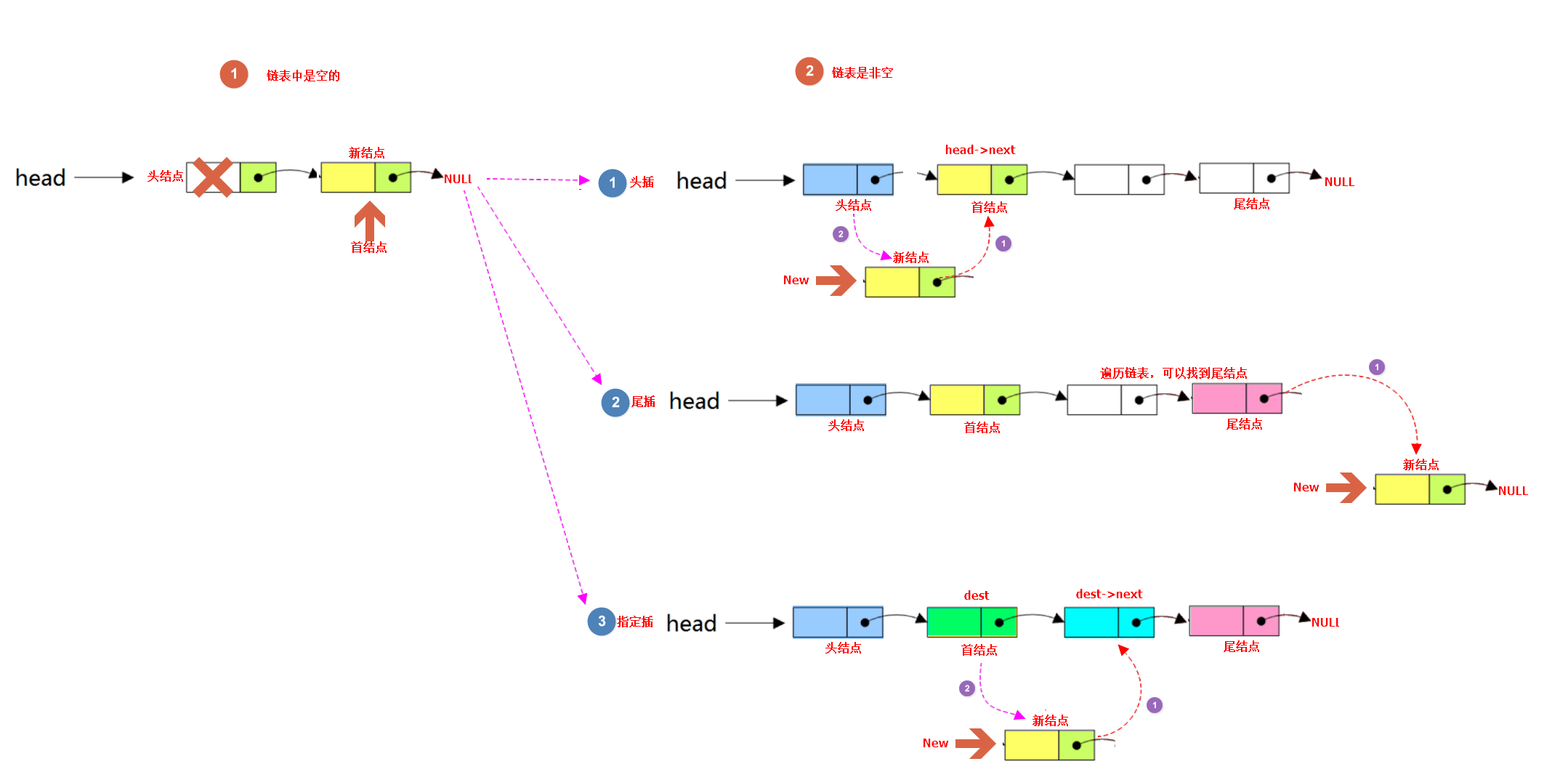 根据情况把新结点插入到链表中,此时可以分为尾部插入、头部插入、指定位置插入。