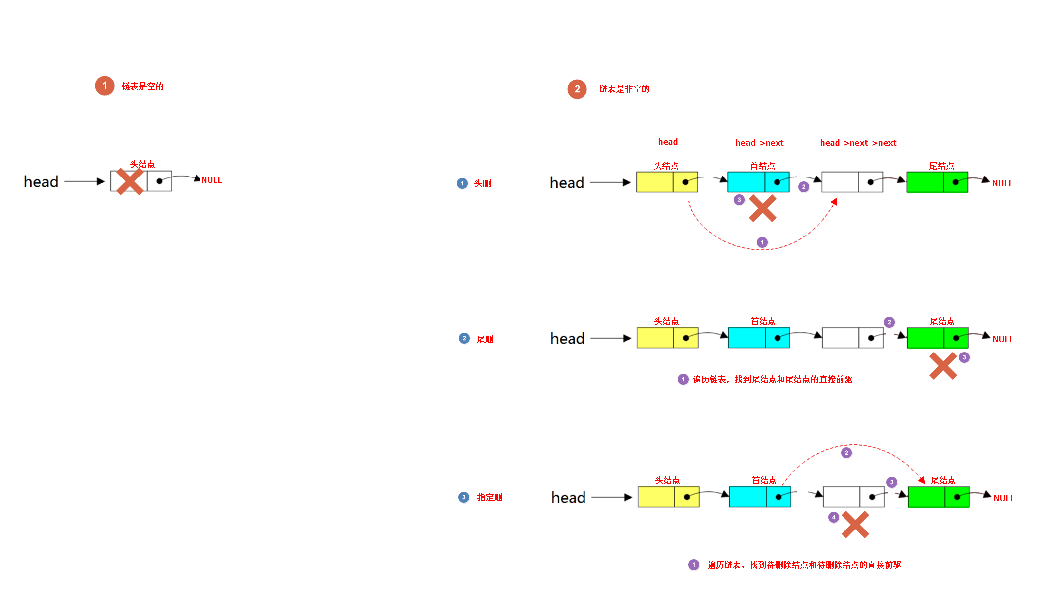 根据情况可以从链表中删除某结点,此时可以分为尾部删除、头部删除、指定元素删除。