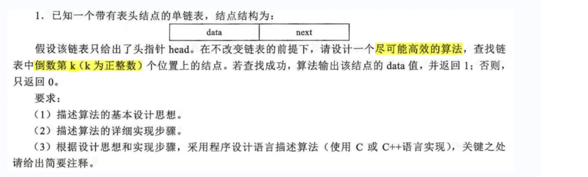 slow所指向的结点就是链表倒数第k个位置的结点,输出该结点的data值,并返回1,表示查找成功。