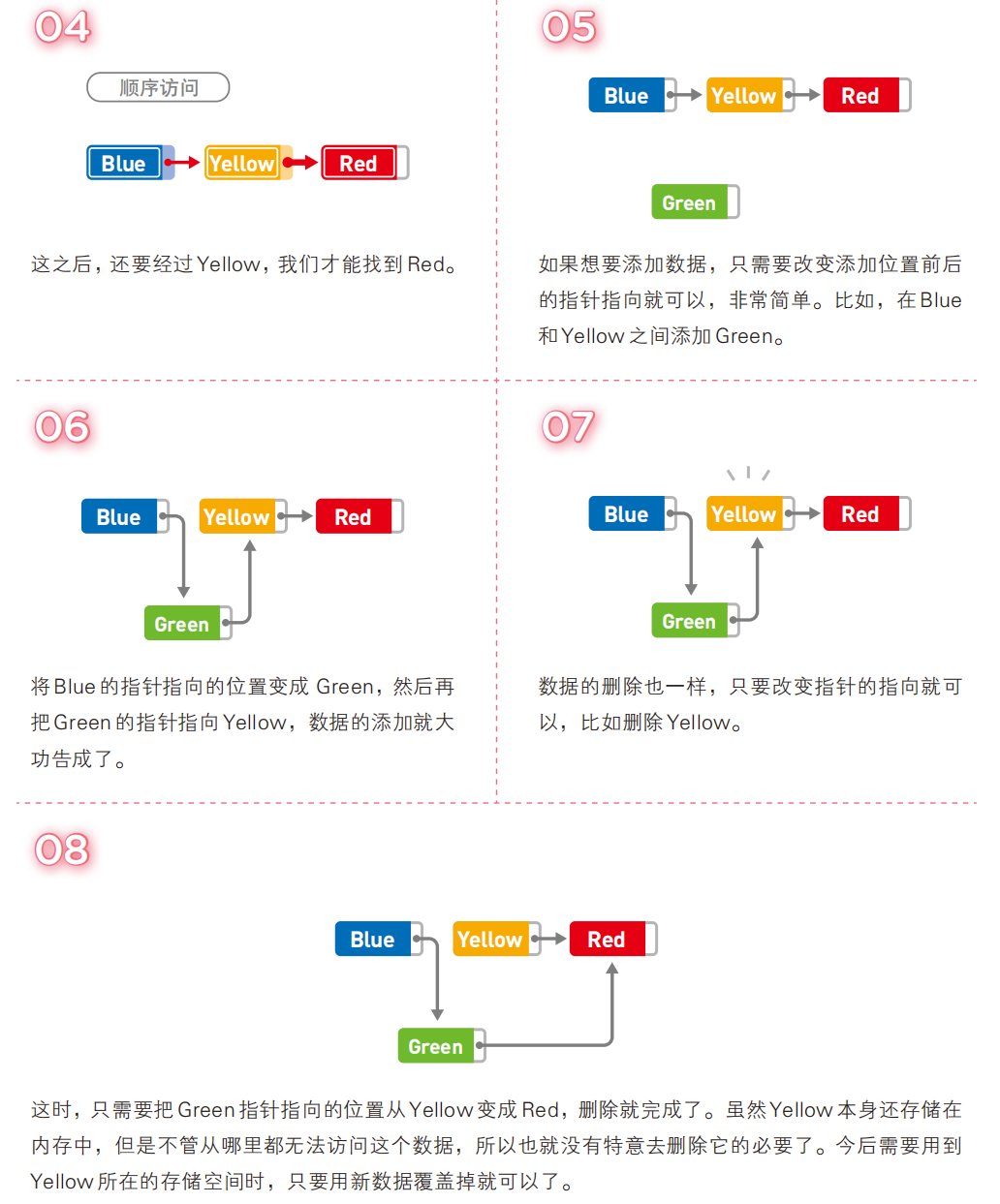 注意:链表的工作原理其实很简单,只要大家搞清楚链表的使用流程就可以很轻松的理解,链表具体的操作步骤如下所示: