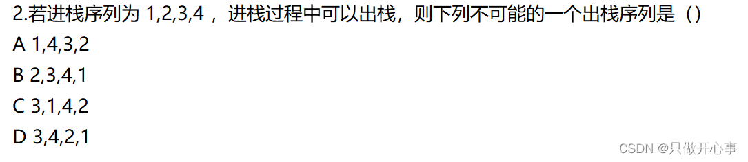 对于D选项:要出3,得先进1,2,3,然后出3,接着要出4,得先进4,最后再出4,接着要出2,1,栈中刚好剩下了1,2,接着再出2,1符合选项。