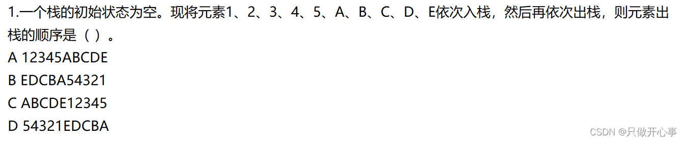 解析: 这个题目主要考察栈的相关性质,我们知道栈的性质是先入后出,所以根据这个性质,不难看出,出栈的顺序就是入栈顺序的逆置,所以此题选b