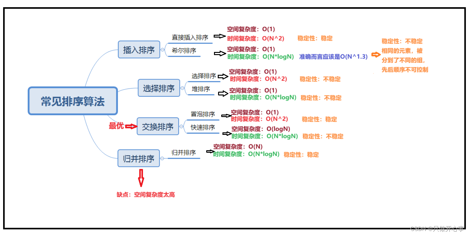 归并排序:最好最坏都是O(N*logN)只有快速排序和归并排序他们俩才会消耗额外额空间,因为递归要频繁的消耗栈帧,且快排非递归实现时运用了栈的数据结构。