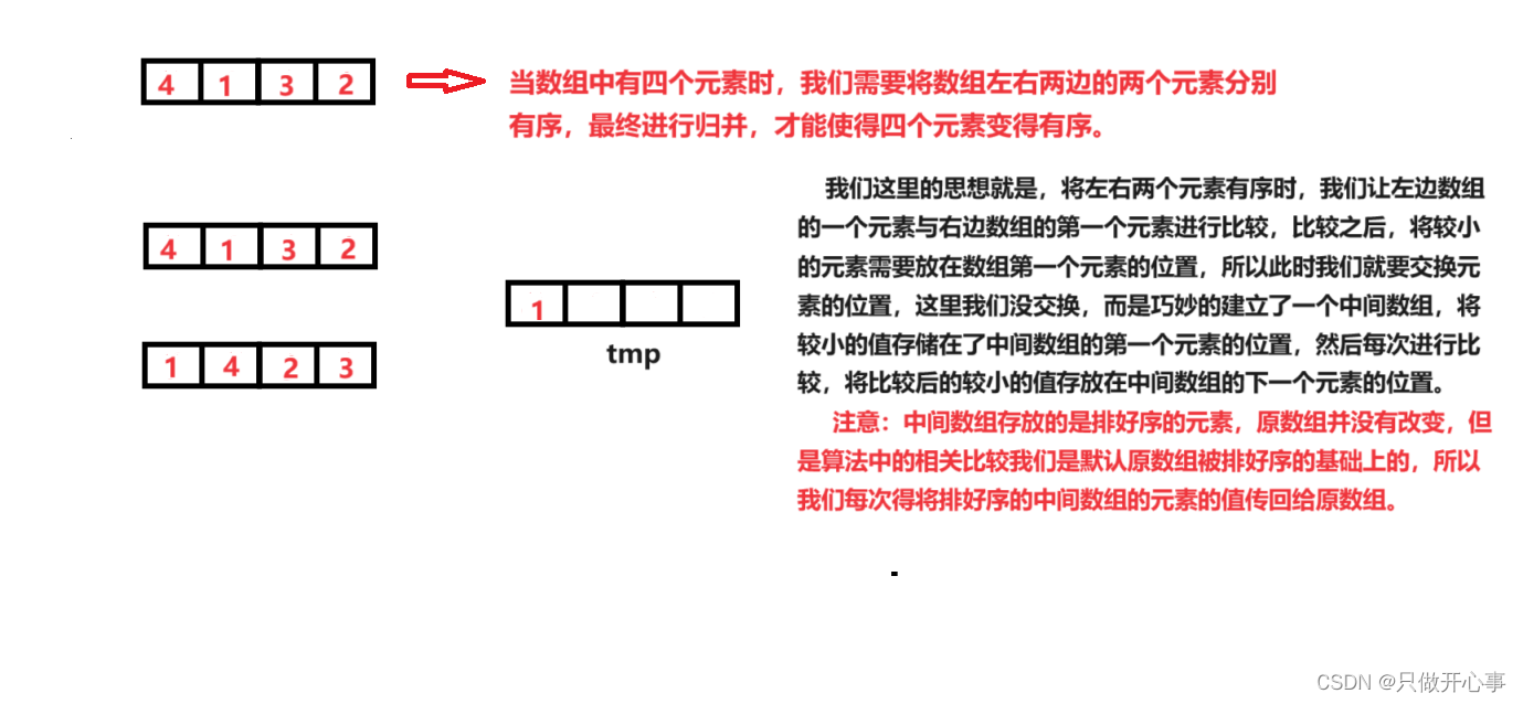 通过四个元素的数组为大家图示讲解归并排序的思想: