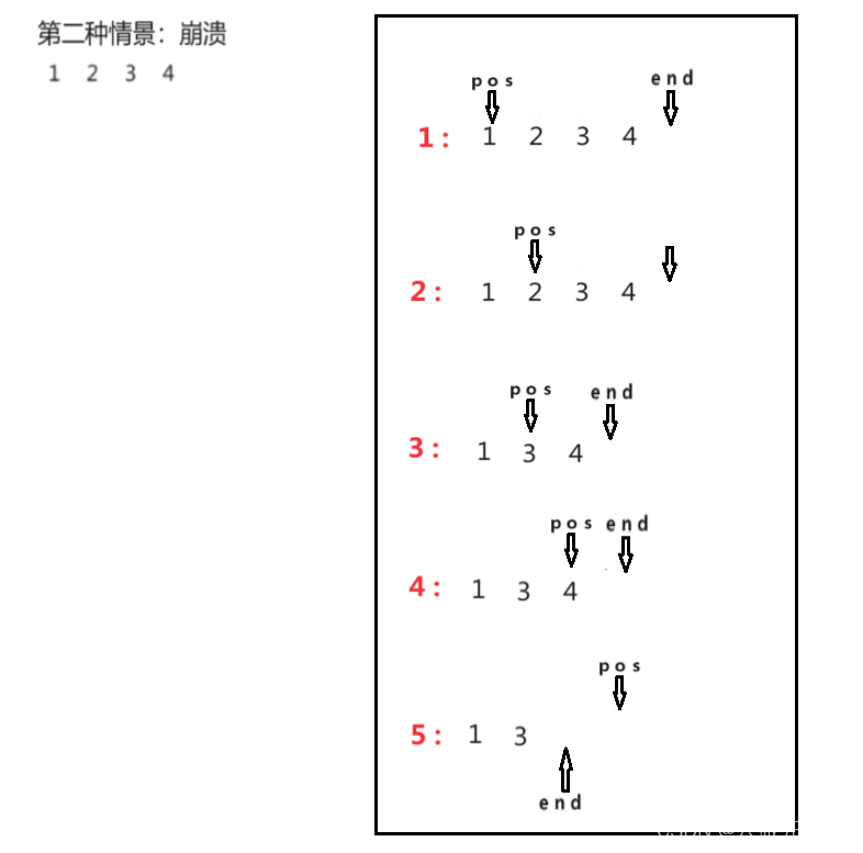 解析:这种情景我们称作连续偶数的情景,在这种情景下,同样是因为,我们再删除完了元素之后先++了pos,因为删除的本质就是将删除位置的元素后面的所有元素统一往前移动一格位置,就会导致要删除的位置的元素被删除之后,要删除的元素的下一个元素就自动的移动到了要删除的元素的位置上,但是我们仍然++pos,就会导致删除的元素的下一个元素被无意间跳过,这就导致了要删除的元素的下一个元素永远无法删除,这便是这种情景没有完全删除所有的偶数元素的原因。