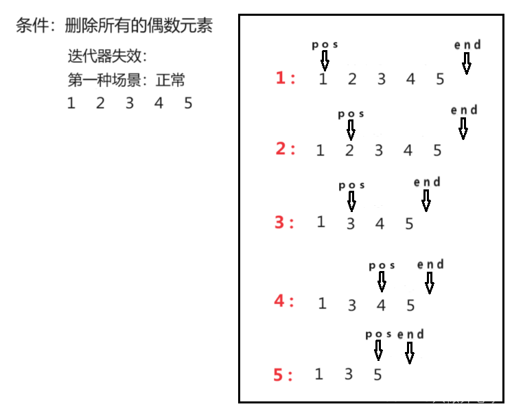 解析:跟第一种情景的思想是一样的,但是到最后会产生迭代器失效,在删除了元素之后,我们会先将指向了删除了的元素的位置的指针+ +,然后再将finish--但是这样会产生一种极端的情况,如图,就是当最后一个元素是偶数时,我们将最后一个元素删除之后,先将指向了最后一个元素的指针++,然后将finish--,这就导致了pos和 finish错位,因为循环的终止条件是pos<_finish,因为pos和 finish错位,这就导致循环不会终止,所以这种情况是有问题的。