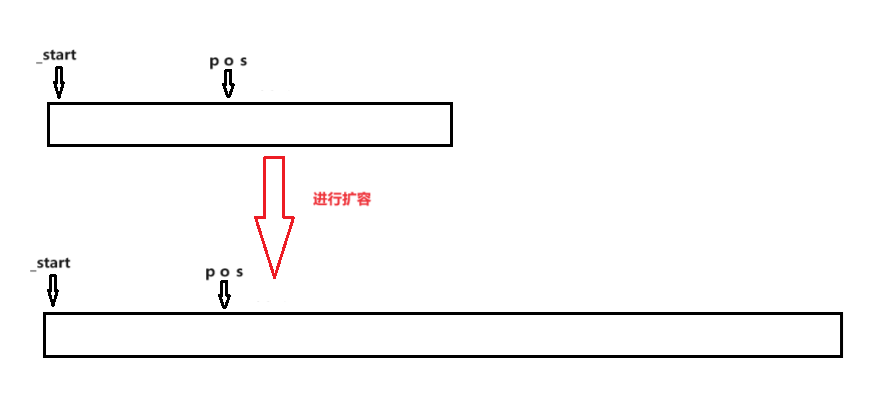 解析:如图,假设在pos位置插入一个元素,但是此时空间不够,所以我们进行了扩容。但是扩容之后此时的pos仍然指向了之前的位置,所以此时的pos就已经失效了(这就称作迭代器失效),所以我们得通过pos-_start的值计算出来pos位置与_start的位置,然后在扩容之后,通过差值计算出来真正的pos的位置。需要注意的是,我们此时的正确位置只是形参里pos的正确位置,但是实参是没有发生变化的,因为insert形参列表中的pos位置传的是实参pos的值,所以我们得通过返回值的方式返回扩容后正确的pos位置。