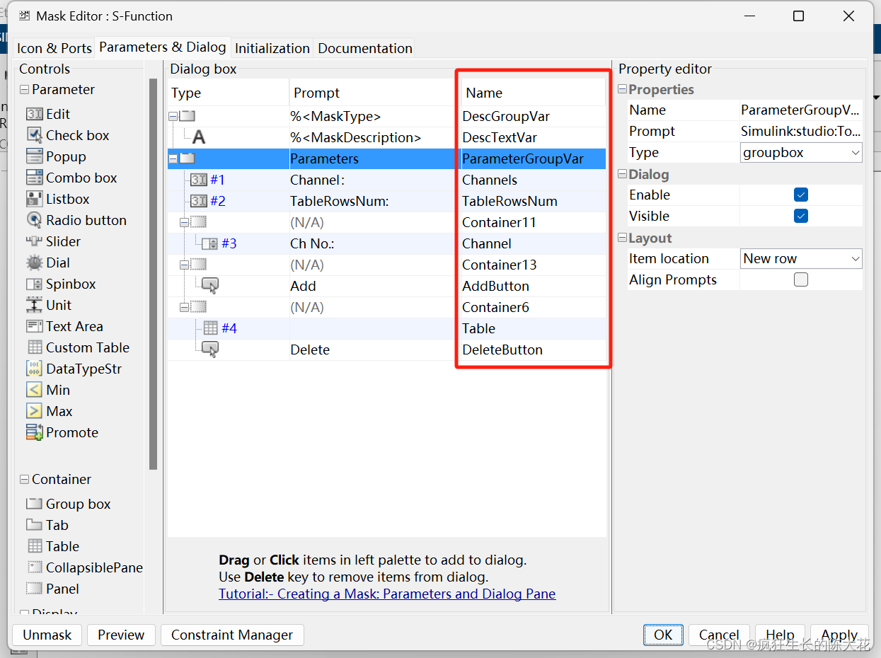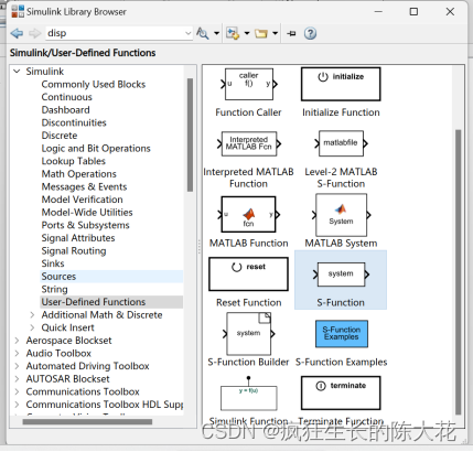S-Function(四)——新建S-Function 双击S-Function模块进行配置,当一个模块编写了Mask后就不能双击进入S-Function模块了,Ctrl+U调出界面。S-function parameters:源文件中使用到的参数,一般是从Mask中传递的参数,详情参照。但是如果没有合适的模块的时候,我们也可以自定义模块来实现功能,也就是自定义S-Function模块。8.mdlOutputs:函数的主体,在运行S-function模块时会循环执行。把选中的模块拖拽到界面上中,即新建了一个S-Function模块。