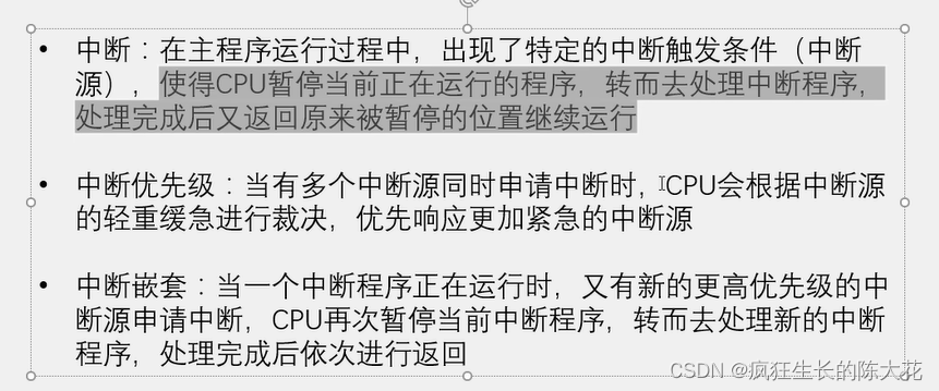 5.EXTI外部中断 中断:在主程序运行过程中,出现了特定的中断触发条件(终端源),使得CPU暂停当前正在运行的程序,转而去处理终端程序,处理完成后又返回原来被暂停的位置继续运行。外部中断:通过监测指定GPIO端口的电平信号,当其指定的GPIO口产生电平变化时,EXTI将立即向NVIC发出中断申请,经过NVIC裁决后即可中断CPU主程序,使CPU执行EXTI对应的中断程序。