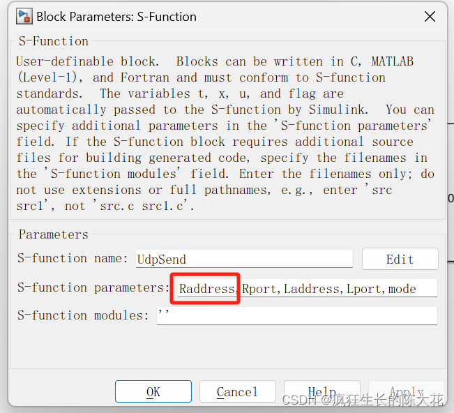 S-Funcion(一)——常用函数 示例:如图所示,S-Function模块Paremeters区域有一个s-function parameters参数,对里面某个参数的内容进行提取,比如我要取第一个参数Raddress的内容。返回值:存储有参数内容的指针,指针指向的类型为mxArray,mxArray为MATLAB中的数组类型。输入:*pm(mxArray类型数组),*str(字符数组指针),strlen(要赋值的长度)返回值:返回double类型的指针,指向从MATLAB中传递过来的数据。描述:将mxArray中的内容赋值给字符串。