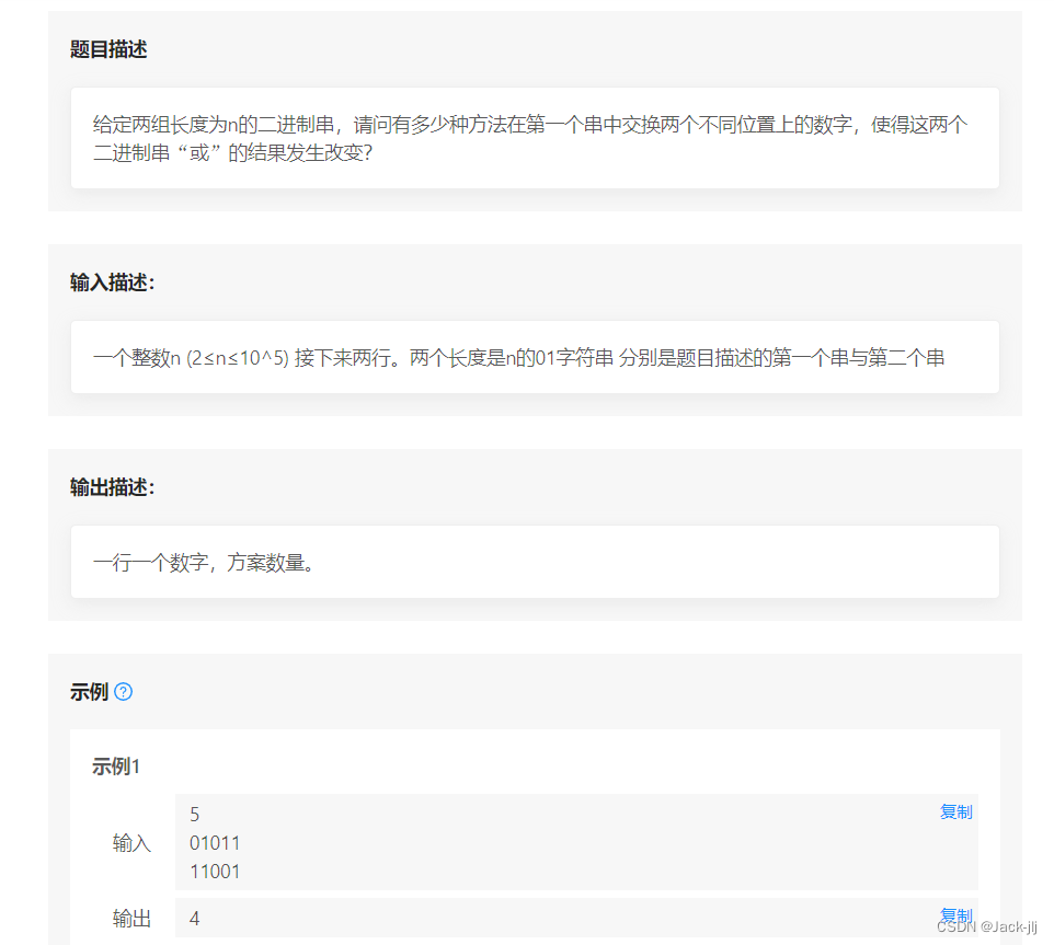 每日一练20203.5.17 按照题目要求,将两个序列摆好,发现,只要第二行的任意一个位置是“1”,那么进行“or”运算之后,结果肯定是“1”。所以问题的关键是第二行为“0”的位置有多少个,因为,这些位置是可以依据第一行的位置上的数字而改变的。如果是有问题,希望有小伙伴可以提示一下。本道题的解题思路呢很简单,其实在进行“or”运算之后,起决定性作用的是二进制序列里面的“1”。设第二行为“0”的位置上,对应的第一行也为“0”的数目为a2,第一行为“1”的数目为把把b2。第一行“1”的个数为a1,“0”的个数为b1。