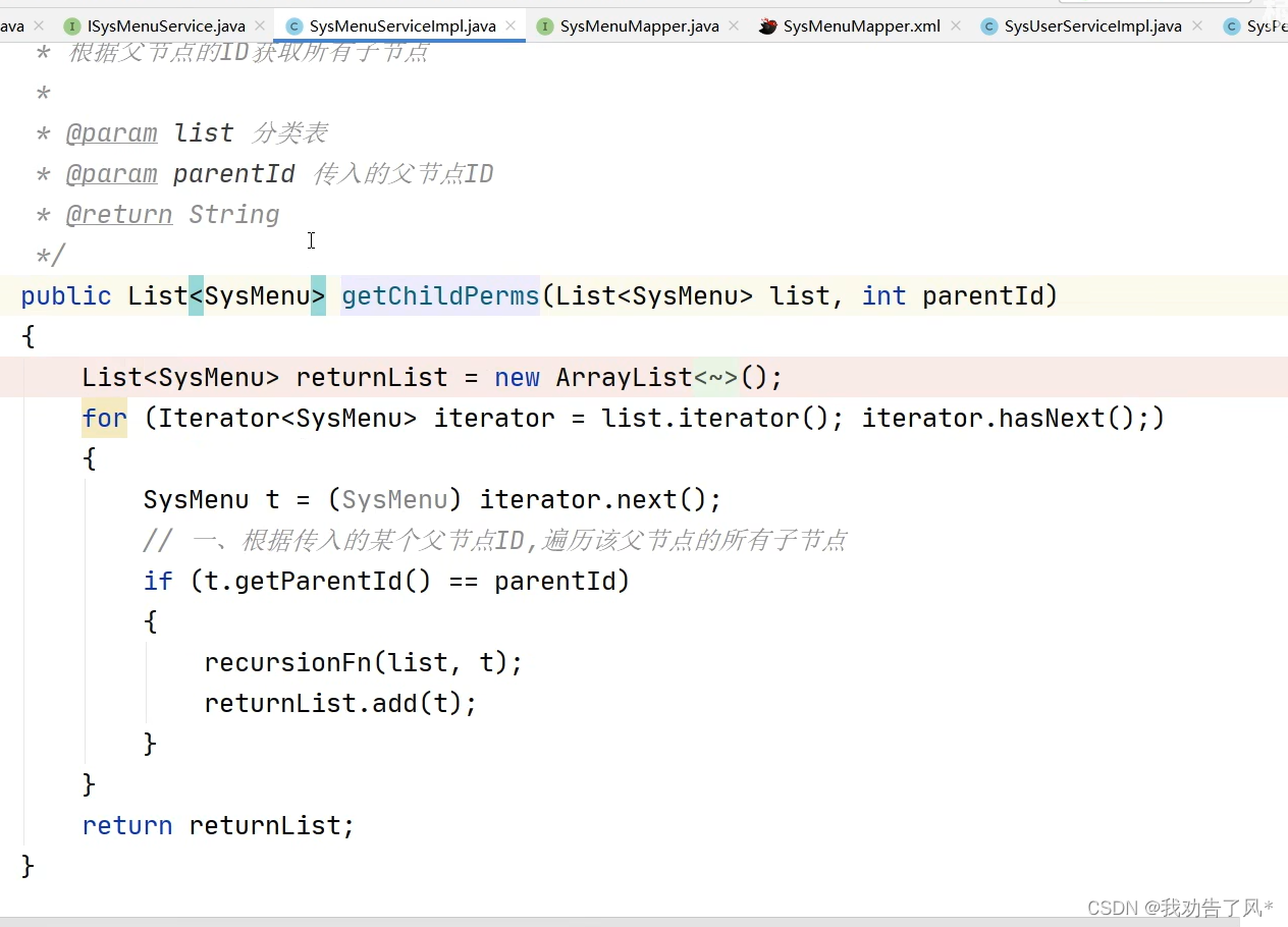 二、若依管理系统----获取用户角色和权限、获取动态菜单路由 总之,在recurionFn()方法中进行循环、递归(待补充)将这些数据拼装成了一个一级菜单、二级菜单、三级菜单的一个嵌套。把数据库里面的,符合角色身份的菜单,查询出来,想办法封装成一个对象,把这个对象传递到。总结:在加载页面的时候,去发送一个请求getRouters(),getRouters()就会把数据库里的数据查询出来,然后把数据组装、嵌套成一个三级菜单的结构,把这个东西丢到前端,前端用一个循环迭代出来,就把菜单加载出来了。3、根据后端查出来的数据menus,然后动态的生成前端的一个菜单。