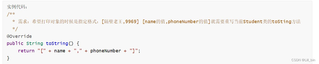 //需求:希望打印对象的时候是指定格式:[隔壁老王,9969] [name的值,phoneNumber的值]就需要重写当前Student类的toSting方法